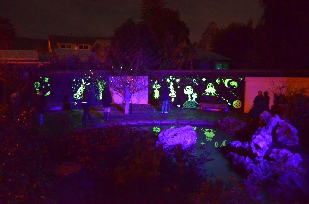 Light Nelson was an art festival in the Queens Gardens, Nelson. It was a collection of art exhibitions by many artists. The goal of the festival was to utilise light, it was set in the middle of winter so the sun set early. I created a piece for one of the exhibitions, we made glowing artwork using glow in the dark vinyl