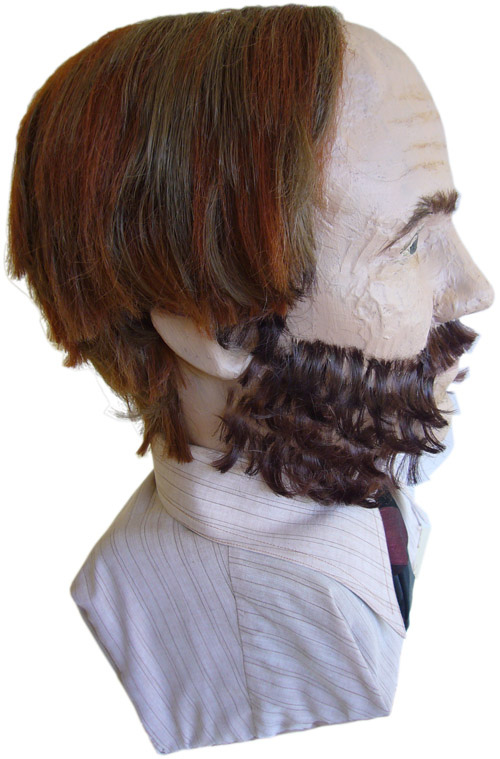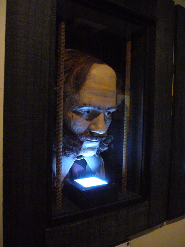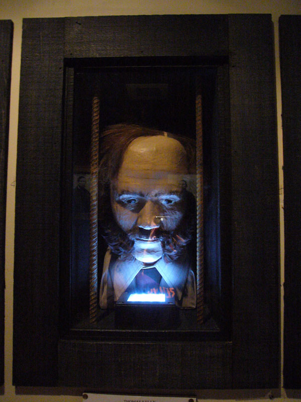 Hand made bust of an infamous member of Nelson, New Zealand’s history, Thomas Kelly. He was one of the four members of the Burgess Gang, who were responsible for the murder of five people on the Maungatapu track, near Nelson, in 1866. It is on display in a glass cabinet at The Verdict Bar in Nelson, which has a theme of the Maungatapu Murderers