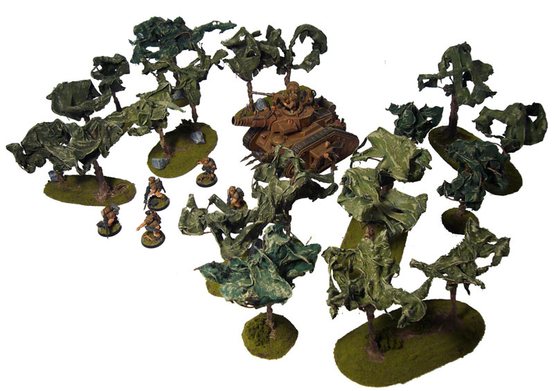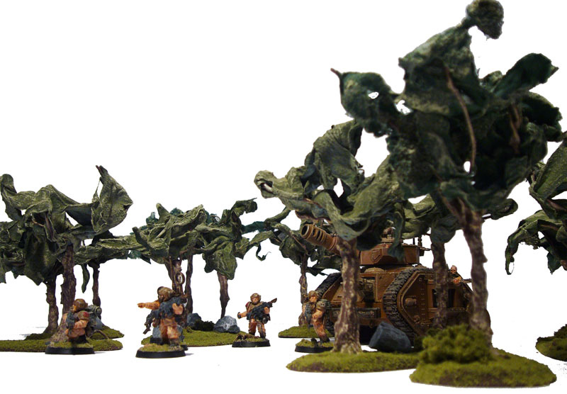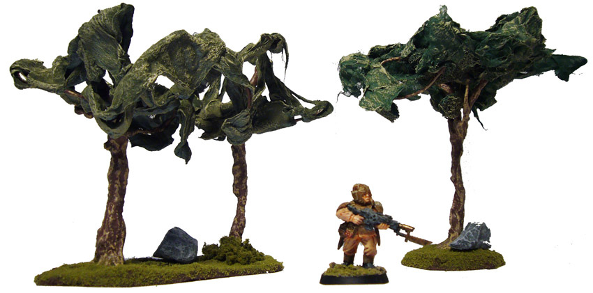 Hand made model of trees for Warhammer 40k or Fantasy, but suitable for any 1:36 scale gameOverall dimensions: 40-70 (l) x 40-150 x 90-120mm (h) eachScale: 1:36Location: Nelson, New ZealandDate: 2006Cost: NZ$160.00 + Postage